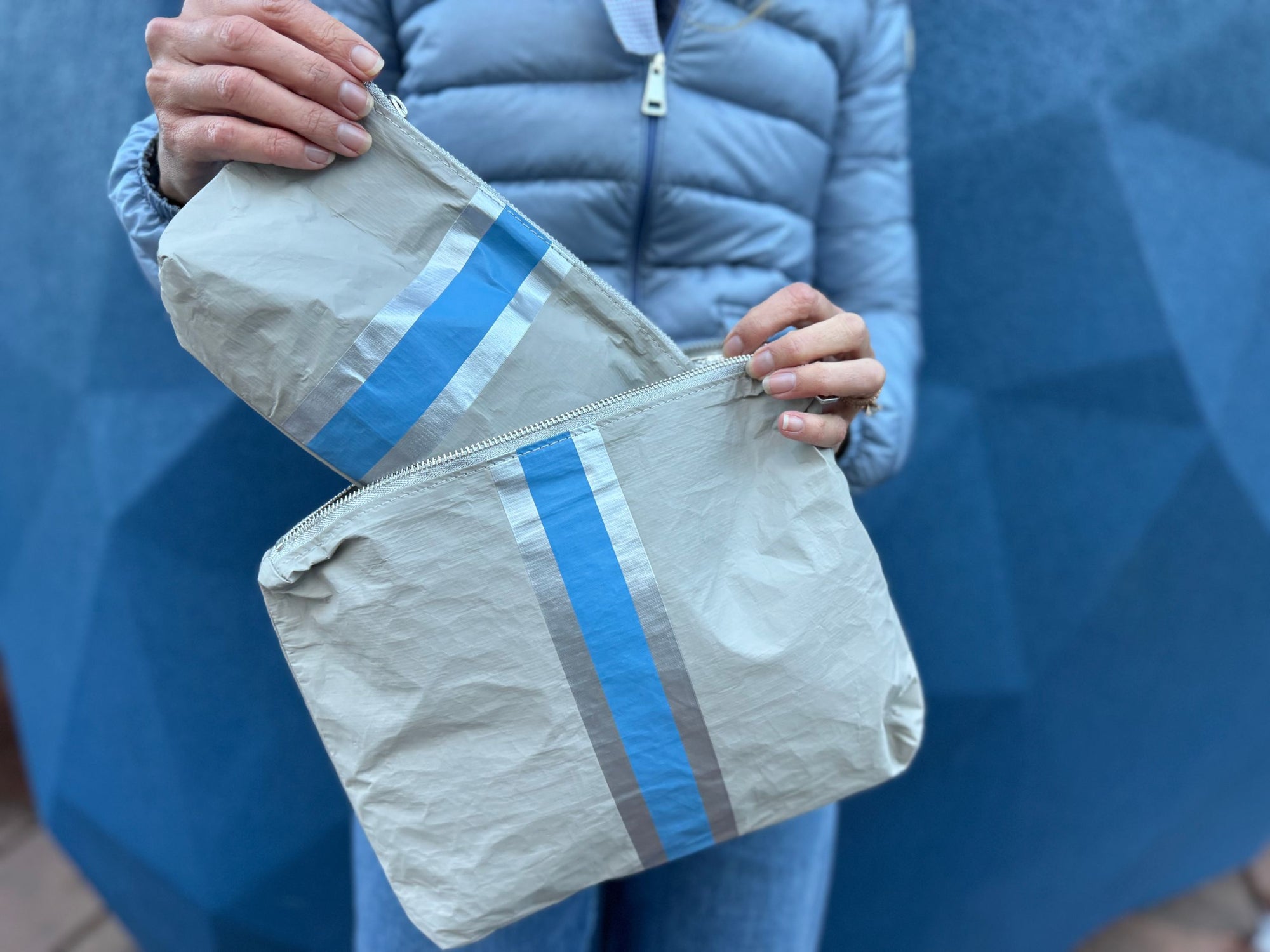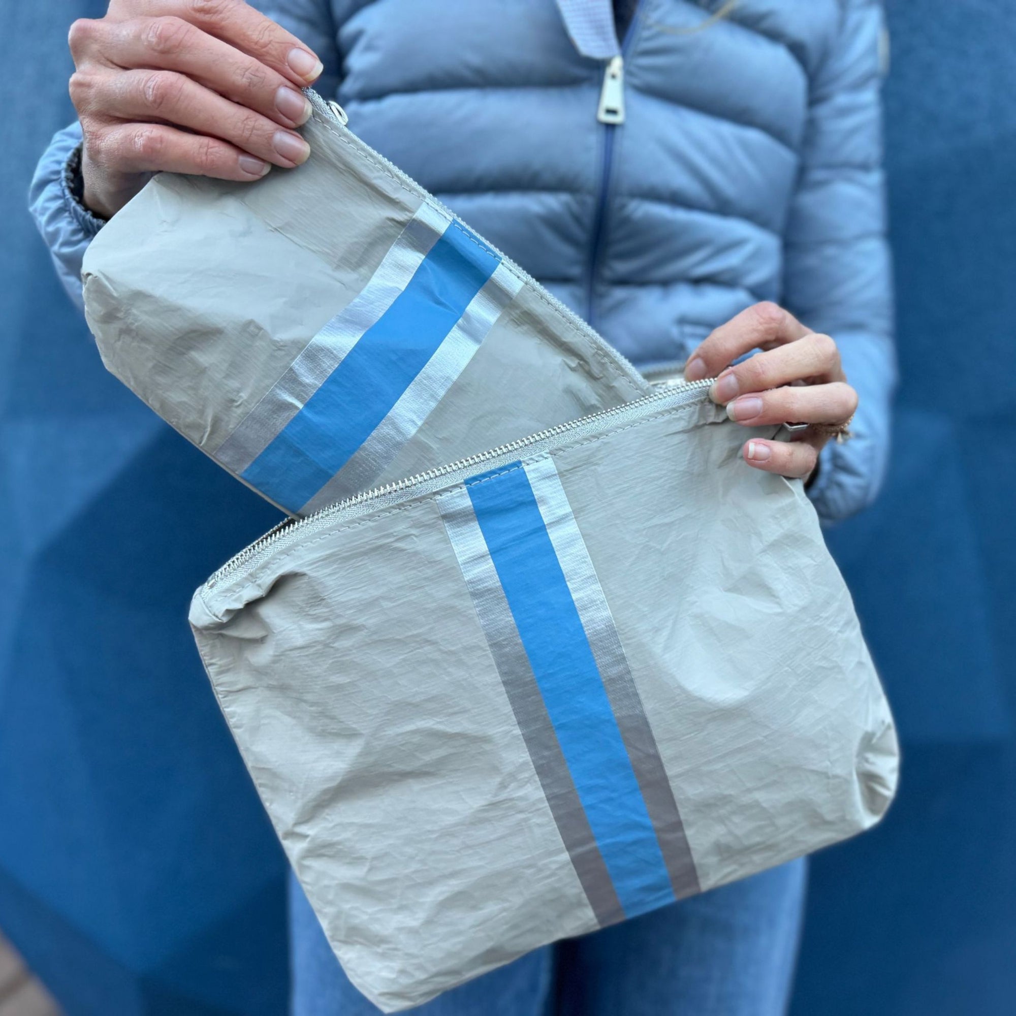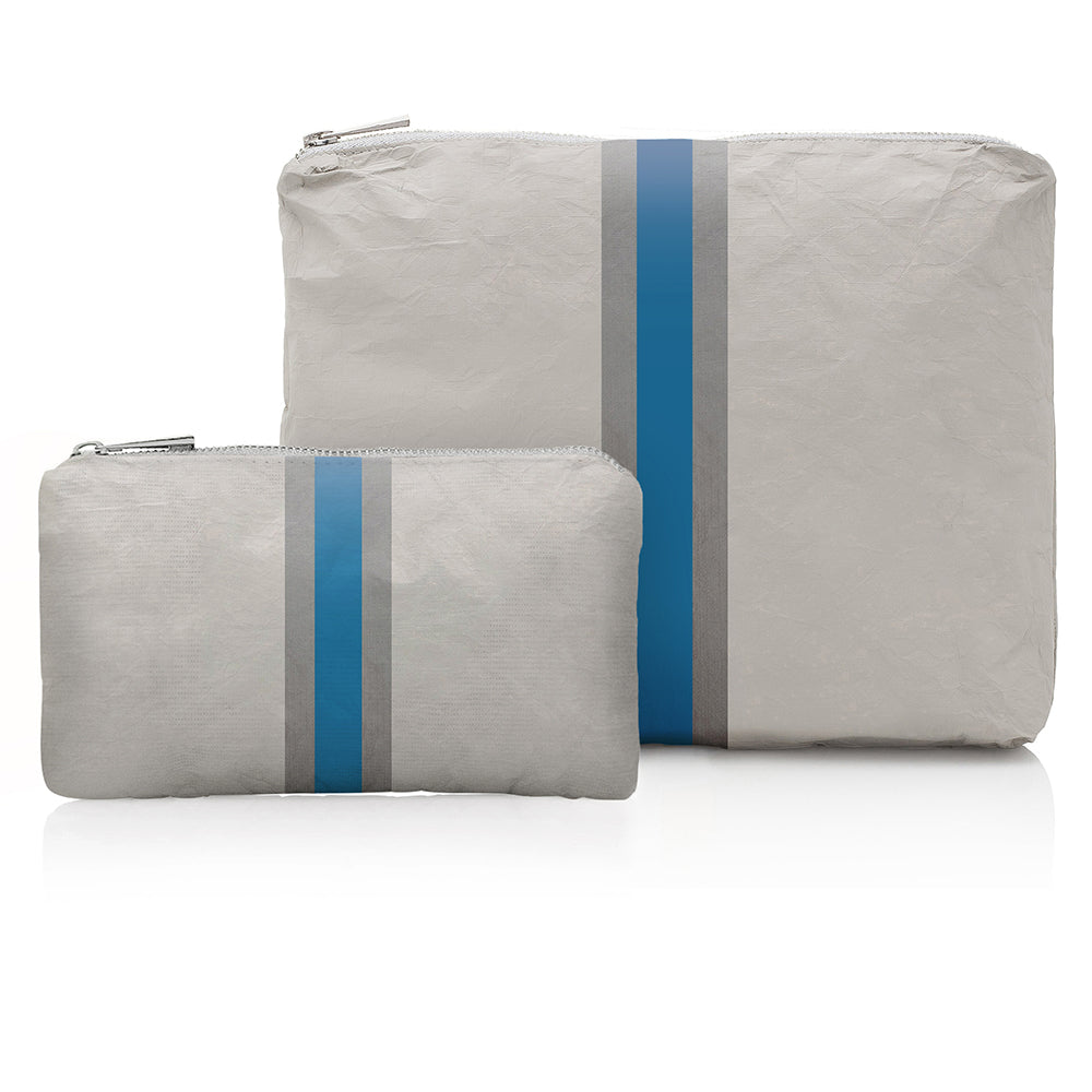 Set of Two - Organizational Pouches - Earth Gray with Sky Blue and Silver Stripe