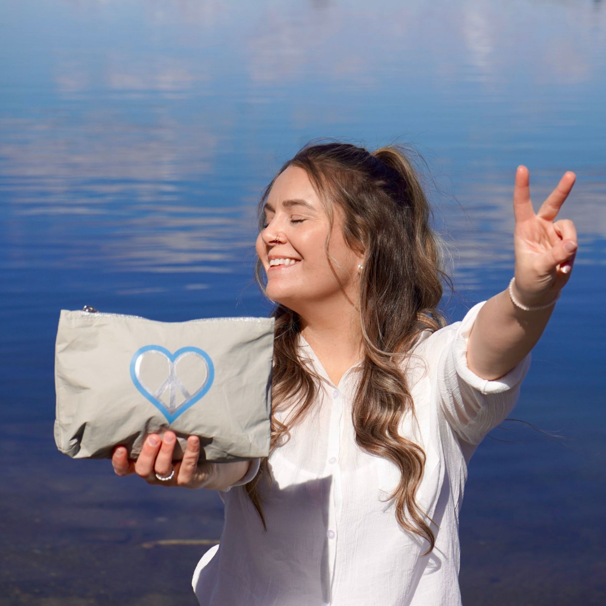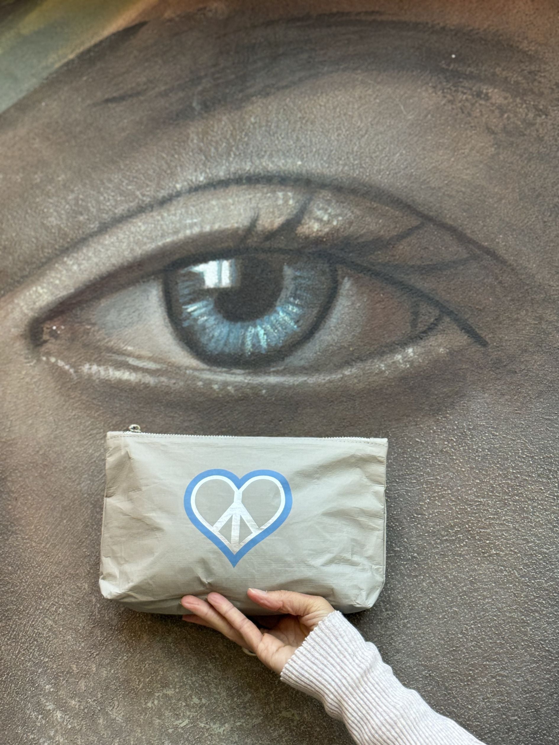 Cosmetic Zipper Pouch in Earth Gray Sky Blue Peace & Love