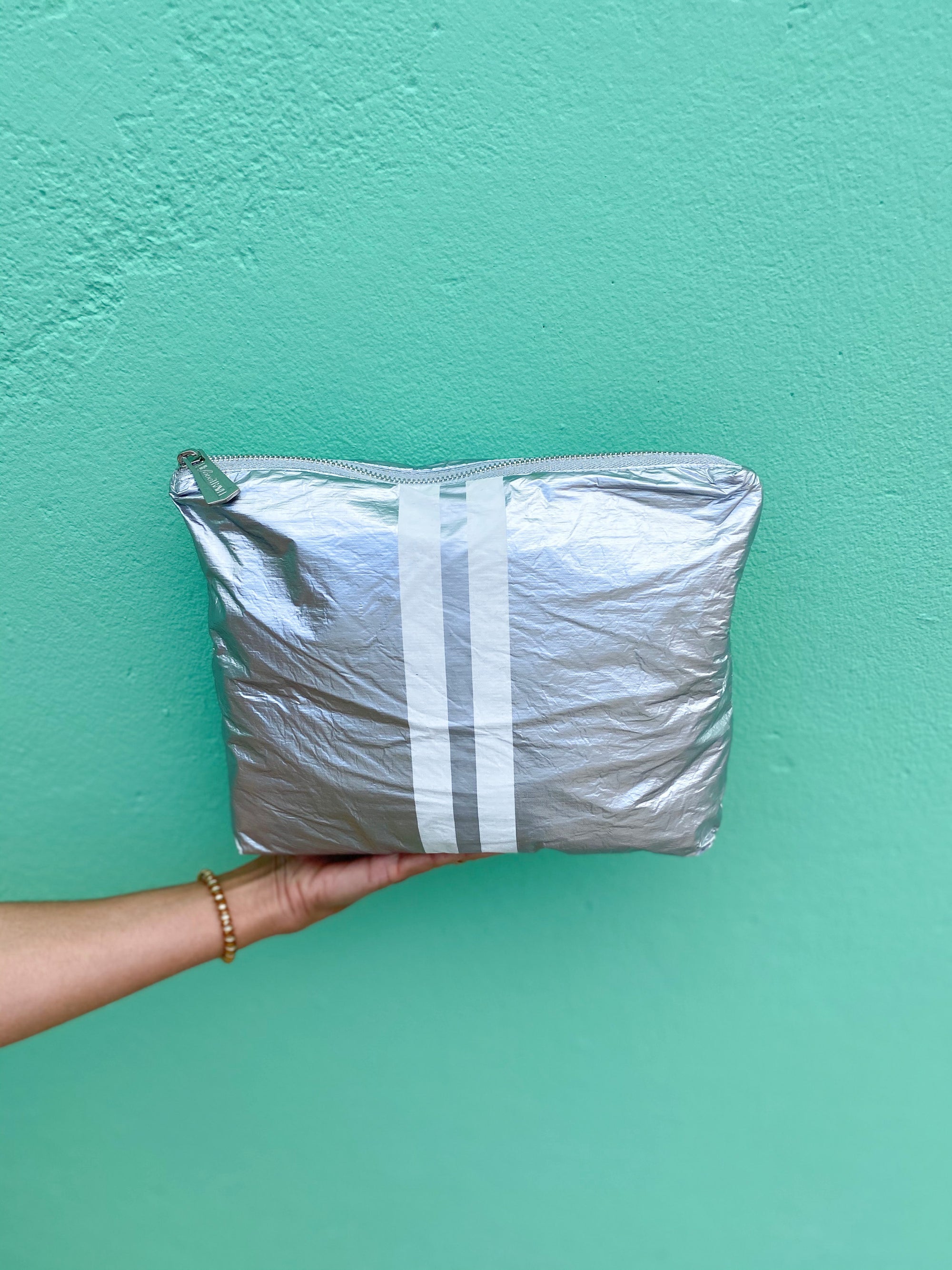 Zip Wristlet in Earth Gray with Sky Blue and Silver Stripe