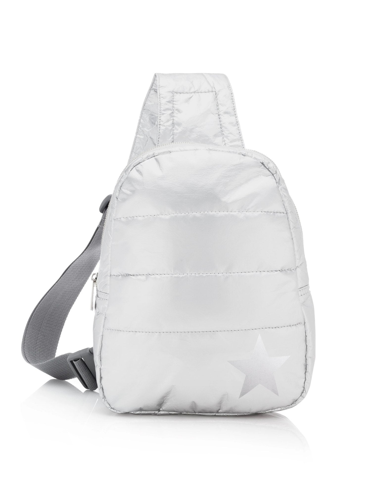 Puffer Crossbody Backpack in Shimmer Gray with Silver Star