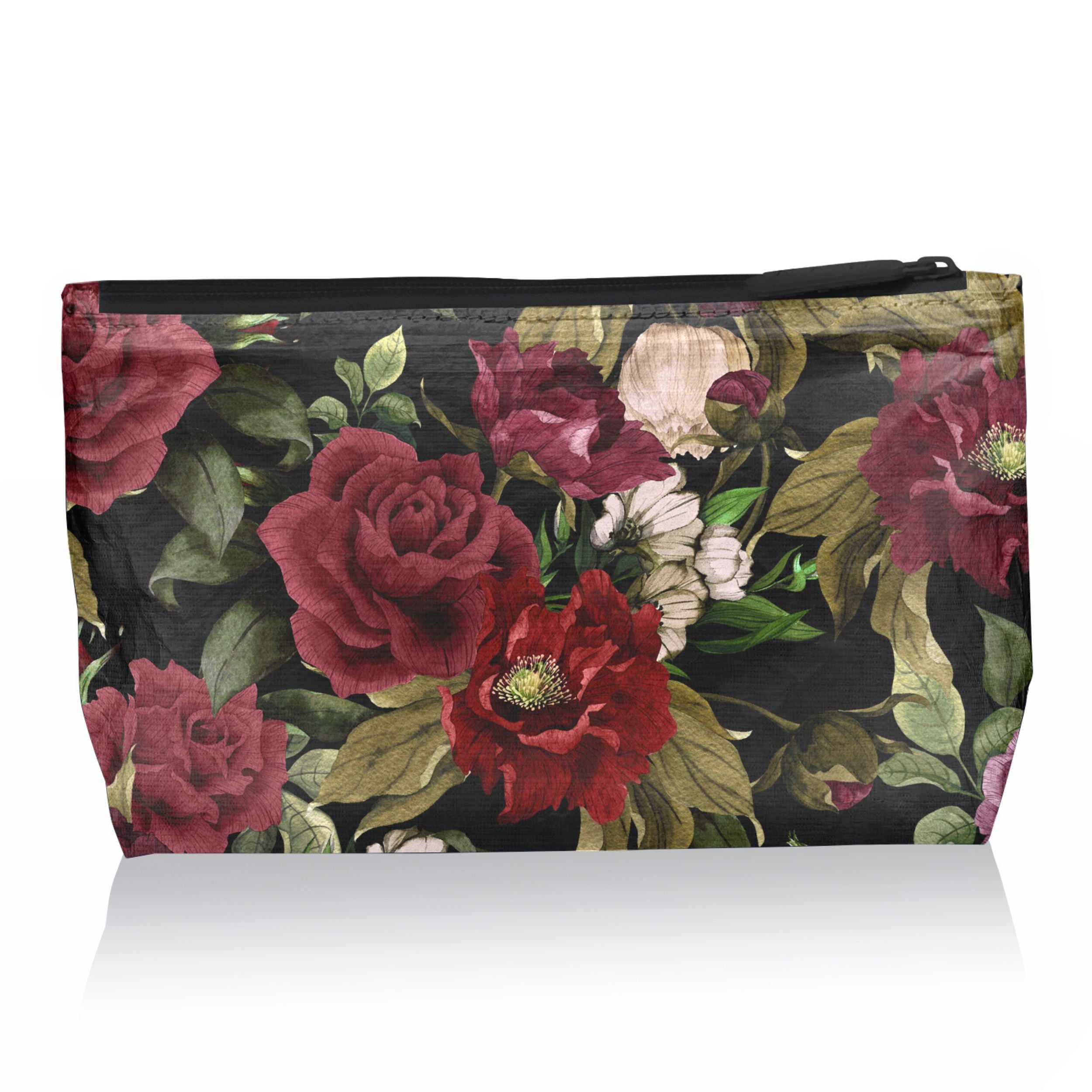 Functional and fashionable cosmetic pouch in burgundy cream floral
