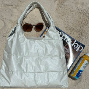 Our newest plush and versatile everyday Puffer Purse Tote in Shimmer White!