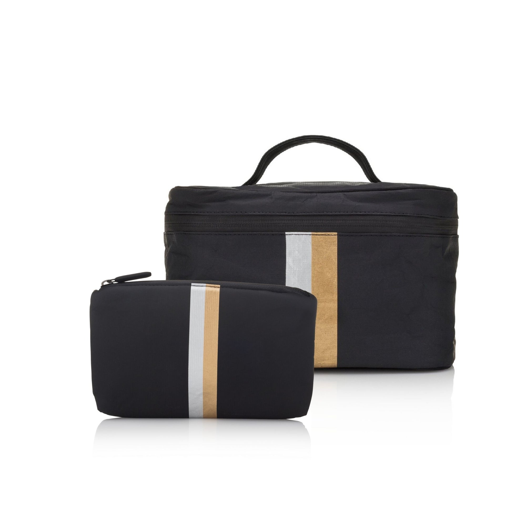 This matching collection of two includes One Cosmetic Case - Lunch Box and One Mini Pouch in Black with Silver and Gold Stripes.